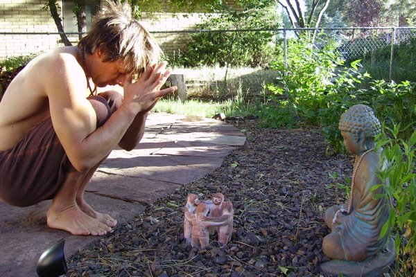 {photos of Coach praying to his “Backyard Buddha” during a part of his Early Morning Ritual which includes “Coach’s Three Refuge Prayer For Those Of Us With Tight Hips.” photos by Ananda.}