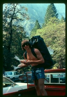 coach ilg, about 17 years old, with a Big Wall Sack (named; “Blucky” cuz he was black and brought good Luck), a bagette, and salami moments before heading up for an attempt on “El Capitan” in Yosemite Valley.