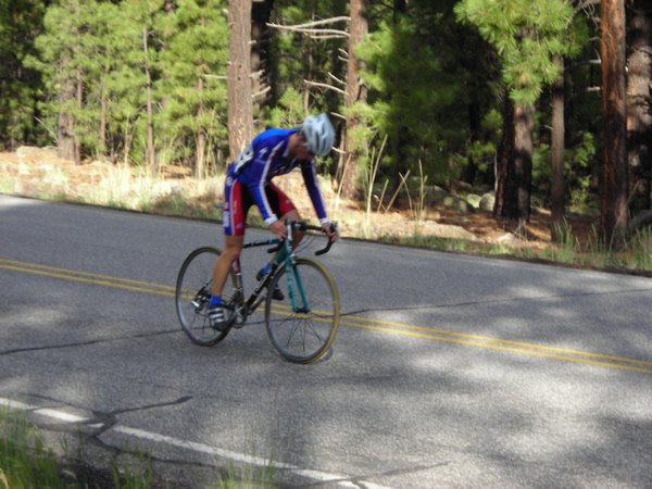 [photo of HP Yogi Ben Sullivan racing up the Snowbowl Hill Climb on Saturday to an excellent time!]