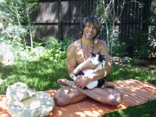 head bowed with Temple Cat Being Jasper to Temple Website Manger Hakado RU! shot during footage for my “Rock Vinyasa” project! just WAIT till you get a load of this utterly unique Self Healing Routine!