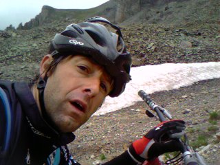 (self photo from cameraphone; “What would my Sangha expect of me in this moment?” became my mantra as i found myself fighting doubt, freezing rain, and fatigue as i had to consistently push my mountain bike, step by step, toward the 13,114′ summit of Imogene Pass…perhaps the most difficult mountain bike ride in the nation…how did i do? what did i Practice? what did i Learn to better serve YOU as a Teacher?…find out only in DIRECT LINES from the Coach That Still Does.)