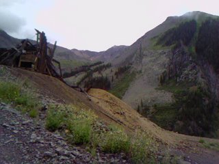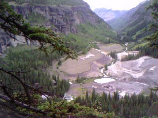 Lower Camp Bird Mine, looking toward Ouray…the route takes a mile long traverse across a 400′ cliff band here before resuming a steep downhill joy ride into town…i reached 48 mph during one section of this descent. those big piles are “tailings” which are continual scars across my San Juan Mountains…tailings are refuse from mineral ore extractions. you may not like the look of it, yet, you probably like having a car and a home and a countless amount of other ‘luxuries’ in your life that come directly from The Mineral Kingdom. am i wrong?