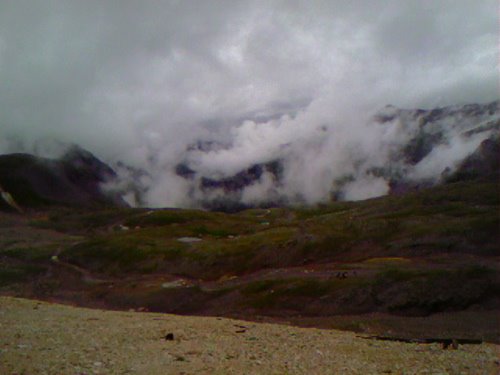 nearly moved to tears by my effort, and feeling sooooooooo sacredly potent, even proud, of my effort and overcoming of doubt i was nearly hit by a motorcycle within 800 meters of the summit, then, 3 more huge jeeps carrying fat people nearly barrel rolled me…as i turned the corner to gain the summit of the pass what was supposed to be…and ALWAYS HAS BEEN a very austere and silent, sacred vortex…looked like a red-neck party at a KOA…i mean, motorcycle punks and lard asses were ripping back and forth across this fragile, fragile alpine tundra that i first ran across under my own foot and lung power from Ouray in the seventies!! i counted dozens of tourists from three different “JEEP TOUR” companies discharged upon my beautiful summit, drinking beers, sodas, smoking, and the noise from all these polluting machines and people was worse than LAX before the weekend. i was appalled…