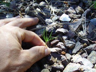 photo 1) this morning after puja; with a heavy heart, i weed out one of the hundreds of baby Ponderosa seedlings currently blanketing the grounds of Two Tree Manor. note my use of Jnana Mudra during this violent action upon a living Being so that at least i am Conscious of the Dharma and karmic consequences while extinguishing the incarnation of this Being. coach ilg photo.