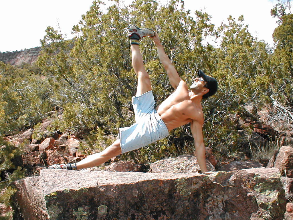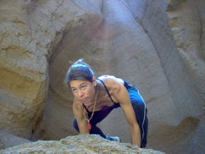 2)WF Teacher Ananda in Bakasana in a volcanic canyon near the WF Temple Home.