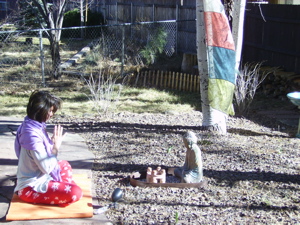 Ananda doing Puja before “Shaky” our Temple Backyard Buddha.