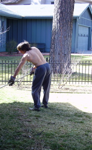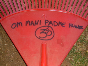 inscribing the WF Sacred Mantra and OM symbol on my garden rake.