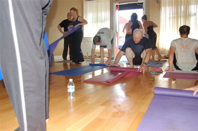 photo 2) Venerable HP Yoga and WF Student Clay Clymore of Santa Clarita, CA rolls up his own yoga mat after faithfully completing the Sweat Management scenario common to HP Yoga in LA!