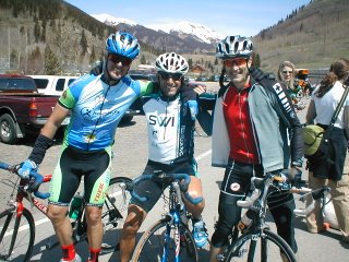 Top Photo: i approach the Finish Line in Silverton, Colorado on Saturday…i made it to the Start Line, i struggled gamely, i Learned, and i Finished. The Spiritual Residual Training Effect from such Noble Effort IS NEVER NOT AMPLIFIED WITHIN OUR PRANIC FIELDS! most importantly, i am coming to Realize that friendships, sculpted from years of Sweat and Karmic Sacred Loops IS THE PODIUM! bottom photo shows Andrew Ferguson on my right. he and his lovely wife, Lana, are putting Ananda and i up in their beautiful Durango home this great weekend. Andrew threw down the hammer on Coal Bank Pass after a slow start (for him). no way i could keep up with him! on my left is WF Devoted Friend and former Online Student, the world class mountaineer Marc Twight (READ HIS BOOKS!!!). Mark (of Salt Lake City and a DL Subscriber) eventually bridged up to me on Molas Pass as i was pedaling like the wrinkled weenie i became. we descended like playful kids into Sliverton together and held hands across the Finish Line; do the Math on the synchroncity of THAT one! ironically, though both Marc and i were in the mountaineering circles and shared the Work together, we never had met face to face. when we did on Saturday by “coincidence” we Recgonized each other as the spiritual brothers we are. you can’t escape Tribal Sacred Hoops even if you want! great photos by my great Swollen Belly Support Teammate; Ananda!