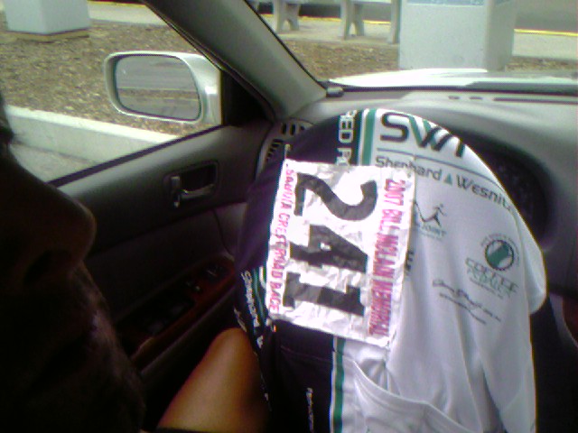 in the Gut Check moments before the start gun the 26-mile, 4,000′ hill climb road race. in lieu of my movie star Beloved to pin on my numbers, i reverted to putting my race number onto my Red Rock Racing jersey with the help of my steering wheel; an old Indian trick. nothing i hate worse than a schleppy race number.