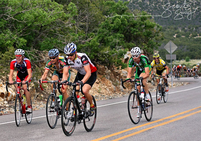 Armijo attacked at an unlikely place which, for him, was likely. he knows no pain, evidently, as he attacked into a head wind about a mile before the steep, tiny ski road that crept up to the 10,400′ Finish Line nearly at the top of Sandia Peak. he got 10 seconds on us and try as we could, we could not close the gap before the ski road.