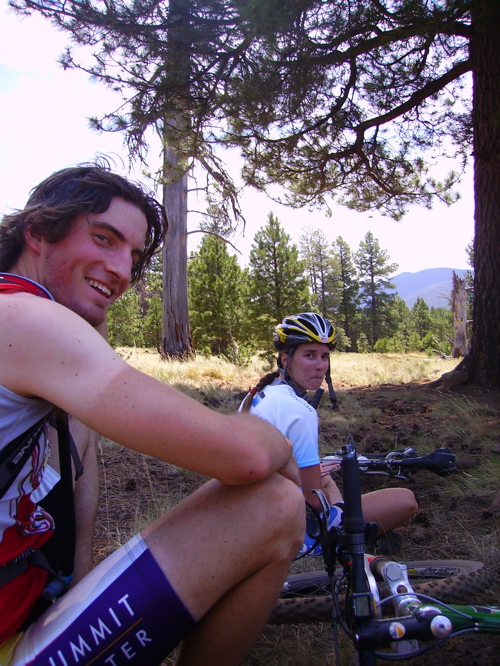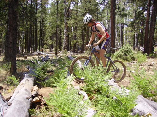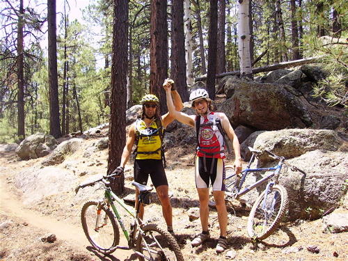 Yesterday’s yoga studio; i teamed up with Ben “Patki Dass” Sullivan – a semi pro MTB racer – whose HP Yoga and BioBuilde devotion has already nabbed him stunningly fit duathlon ascents of both Kendrick and Humphrey Peaks, the latter being the Sacred Peak of Doko Oosliid herself at 12,633′. Next to Patki is Jen Sica, a pro MTB racer and a former Board Member of my RED ROCK RACING TEAM http://www.redrockracing.org/ . we took this rest break after climbing a variety of wildflower studded alpine meadow paths for about 2 hours and 3,000′ to arrive here at the Wilderness Boundary elevation hovering around 9,000′. This is these kid’s idea of a ‘warm up’ before we got to the ‘fun stuff’; the technical descents of the Secret Trails beneath the Sacred Peak.