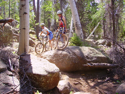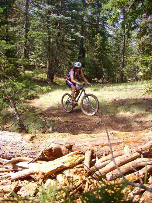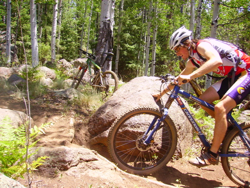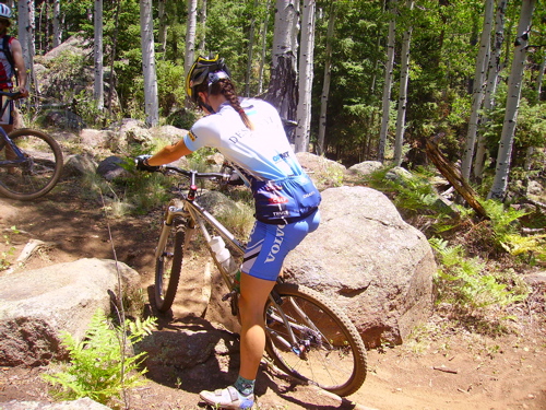 Tingly Times; yup. leave it a stinkin’ girl to have the balls to be the first of us to roll this obstacle! Jen, who can climb up technical singletrack faster and more poetically than a Mountain Goat, also showed us boys that rolling over boulders “…ain’t soooo baaaaad…”! “Come on boys, you can do it!” she smiled sweetly to Patki and i after i took this shot.