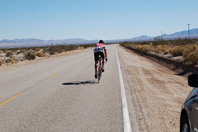 The first 40+ miles were amazing and I was feeling incredible, knocked out this section in a shade under 2 hours. This section was the preamble to the climbs up and over Jubilee and Salsberry Passes. Here I realized the huge difference between our local climbs in the San Gabriel Mountains and the desert…no more switchbacks, no flat sections between short climbs…just long, straight, relentless climbs with nothing around but the desert sand and sky. As I started up the first climb, one thought echoed in my head in between counts of my pedal strokes…’Don’t add Drama, add more Breath’. This singular mantra carried me up and over the mountains, despite the relentless grade, the dropping temperatures and the increasing (head)wind. When I reached the summit of Salsberry Pass, I thrust my fist in the air, let out a ‘Yeah Baby’ and prepared for the descent….unfortunately into that head wind which was now picking up the desert sand and hurling it at me with some velocity. As I started to shiver, question my motives and really wish I was inside the van, I remembered that I was the lucky one…alone on my bike, blessed with the health and means to do something like this as recreation, and thru my efforts sending waves of chi back home to my twin daughters and loving wife.