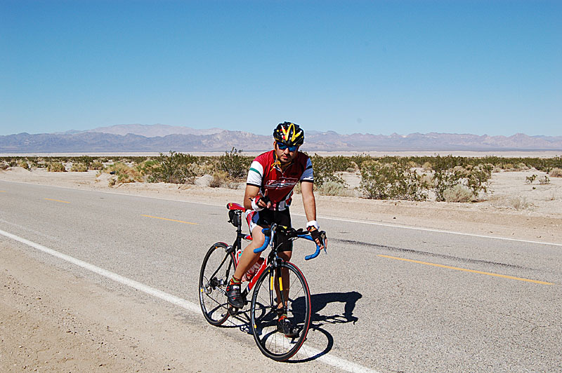 The first 40+ miles were amazing and I was feeling incredible, knocked out this section in a shade under 2 hours. This section was the preamble to the climbs up and over Jubilee and Salsberry Passes. Here I realized the huge difference between our local climbs in the San Gabriel Mountains and the desert…no more switchbacks, no flat sections between short climbs…just long, straight, relentless climbs with nothing around but the desert sand and sky. As I started up the first climb, one thought echoed in my head in between counts of my pedal strokes…’Don’t add Drama, add more Breath’. This singular mantra carried me up and over the mountains, despite the relentless grade, the dropping temperatures and the increasing (head)wind. When I reached the summit of Salsberry Pass, I thrust my fist in the air, let out a ‘Yeah Baby’ and prepared for the descent….unfortunately into that head wind which was now picking up the desert sand and hurling it at me with some velocity. As I started to shiver, question my motives and really wish I was inside the van, I remembered that I was the lucky one…alone on my bike, blessed with the health and means to do something like this as recreation, and thru my efforts sending waves of chi back home to my twin daughters and loving wife.