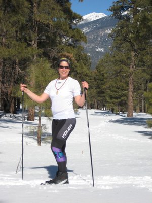 this is Ananda with Doko Oosliid, the Sacred Peak protecting Her. Ananda (aka;Joy to you new DL’rs) is the amazing Mother of Dewa. She is also the Beloved Partner of mine. less than five months ago, she had a baby. today, she is cranking out in Brahman’s beautiful snow, taking a Classic Ski lesson from me during a nordic jaunt about a serene ponderosa mesa about 10 minutes from our home. yep, that’s right, we finally got a babysitter and the first thing we did? GO SKIING BABY!!!! we ain’t no dummies.