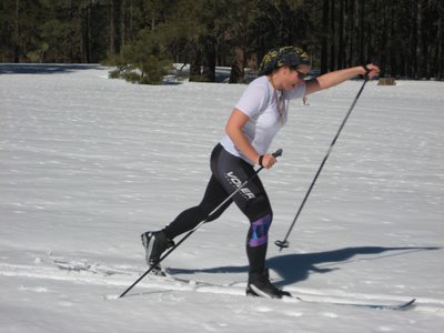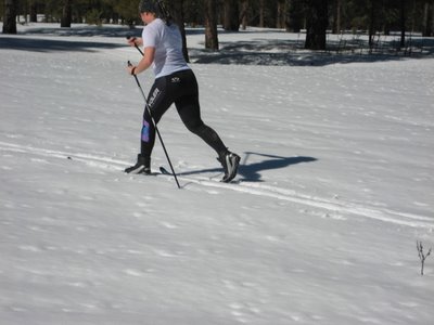 The “kick” in the “kick-and-glide” or Classic Stride is not so much a “kick” as it is a “pop-step.” See, in Classic Skiing, you have either sticky wax or a’fishscale’ pattern cut into your skis beneath the binding area. it’s this area that you HAVE TO COMPRESS INTO the snow by bending at the knee and ankle as the ski passes underneath your center of gravity. see how Ananda’s left leg is slightly bent in the above photo? in this miraculous moment she gets sufficient grip to move her body forward of that position by pulling back with her ski.