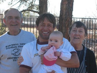 photo#1; the current new daddy ilg (me) the old daddy ilg (Henry, my dad to my right), grandma ilg (Marjorie Catherine, my mom to my left, and some my new live-in Guru Rinpoche who knows everything about everything; Dewachen Catherine Ilg. photo by Ananda.