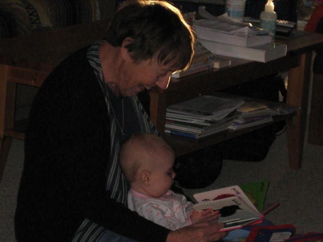 photo #3; Grandma ilg and Dewa reading. Dewa already has superb Radial/Palmar motor skill coordination; She turns all the pages by using her thumb and can ‘palm grip’ Her milk bottle…She can stand with support and hold concentration far better than most ‘grown ups.’ Being fed through Ananda’s breast milk the SUNRIDER Herbs and MAP Amino Acids has greatly accelerated Dewa’s physiologic command stream. Though She only eats about half of what typical American babies eat, Her mood is always happy and Her energy is Lightfull. there are no kaphic tendencies whatsoever in Dewa’s constitution; She is as Clear and Awake as the little Light that She is…in other words, so far, so go(o)d…