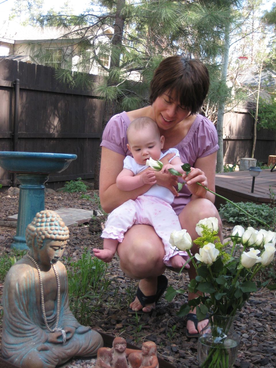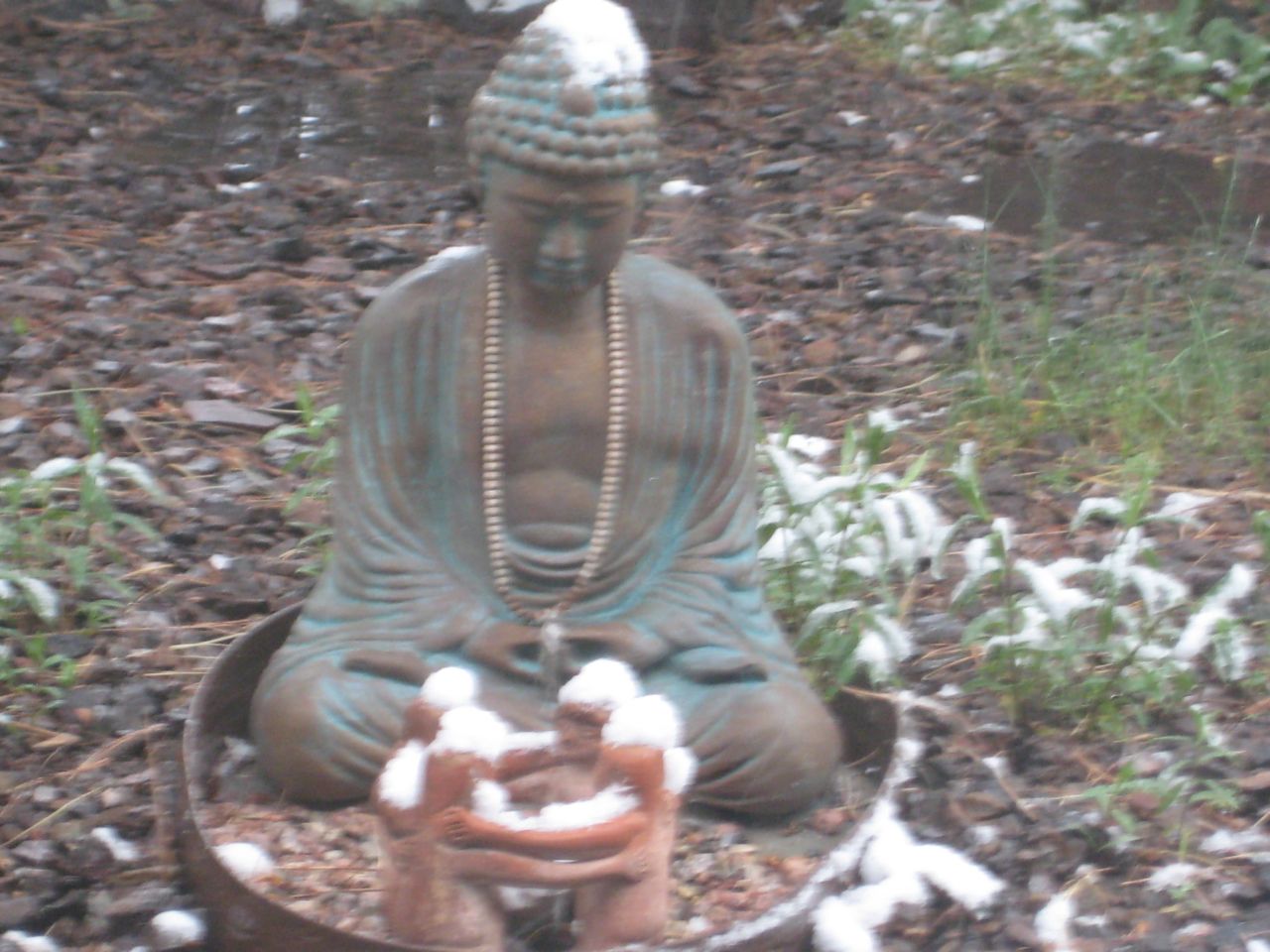 …”Shahky”, our Backyard Buddha poses with Dewa and Ananda on Mother’s Day…