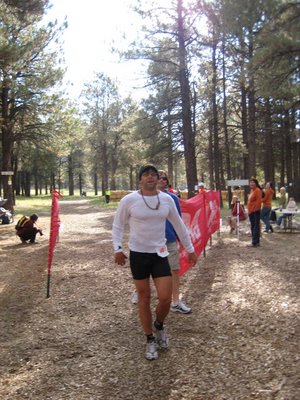 Ilg at the Finish Line of yesterday’s high altitude 10k at the Flagstaff Nordic Center. Coach re-tore his hamstring within moments of the Start. This incredible account of pure spirit will once again stuff your Dharma quiver as you read what Inner Tools he used and provides exclustive answers to the spiritual/karmic confrontation which arises at such intensely painfilled endeavor and WHY it became so vital for him NOT TO QUIT; “let ilg be once again your willing spiritual laboratory rat for this is precisely the spiritual terrain where so many athletes flounder; though we are driven again and again to pain of sport like moths toward Light, conventionally trained athletes keep coming up empty with the “Why” of what they are driven to do…” photo by Ananda
