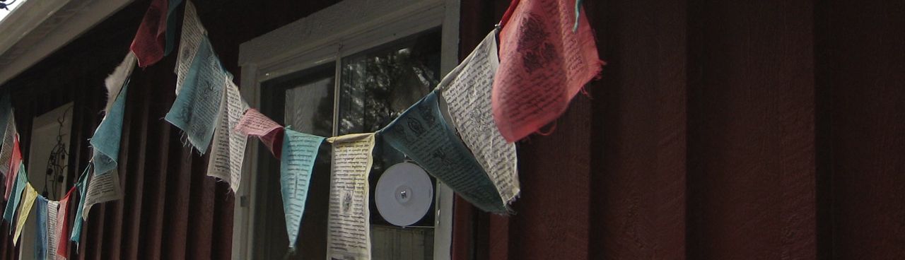 Tibetan Prayer Flags, mindfully unpacked from my Zendo box and hung with the Mantra, send the Dharma outside our kitchen window…