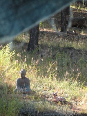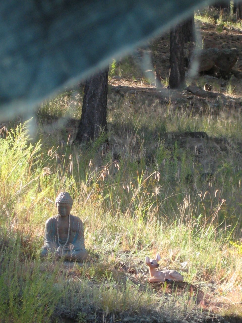 my precious ol’ “Shaky” (short for Shakyamuni)…a DL Reader icon…now anchors the chi of the hillside right in front of our home. The first DLr who can email me the significance of my positioning of “Magdalena” the deer, next to Shaky gets a free copy of my latest book, PRANIC JUNKIE . Shaky is VERY stoked to be here!