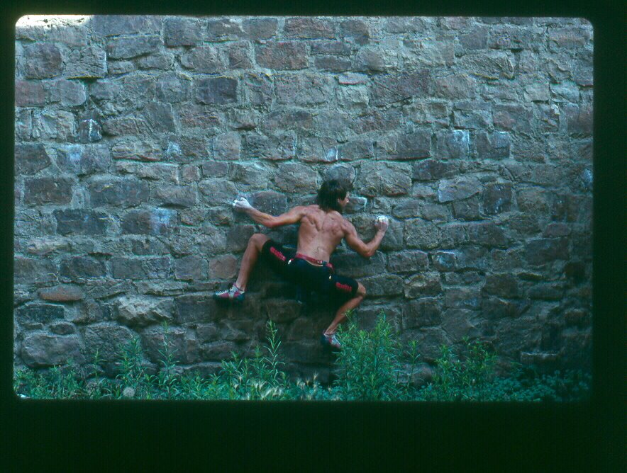 Pagosa Springs, Colorado. circa 1990. i called it the Balloon Saloon because the route was this excruciatingly long traverse along a historic wall of an old saloon in downtown Pagosa Springs, and you had to be as light as a balloon to make it. so much as breathe too heavily, and you’d be off. and i fell off this thing a hundred times or more over the course of an entire summer. i had to get my bodyfat to 2% before i was successful on this route and you can see how lean i was! it’s always a matter of ‘how bad do you want it?’ photo by Jennifer Heightley.