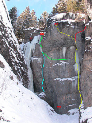 reflections of myself. The upper pitches were WI 3 and 4, rambling