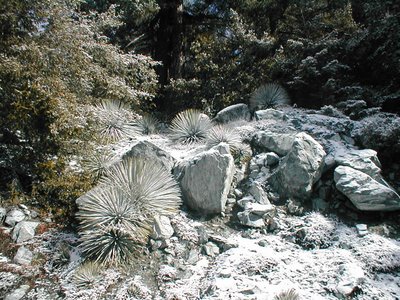 photo 2: Near the Mt. Baldy Zen Center…i took this when going skiing at Mt. Baldy where i do TAF that WF Devotee of 20 years, Ron Zolnick, is a ski instructor. i absolutely adore the zen qualities of the just fallen first snow upon the old rocks, sharp catci, and guardian pines in this Brahmanically gifted (what is not?) shot. nature is ilg’s ishta devi.