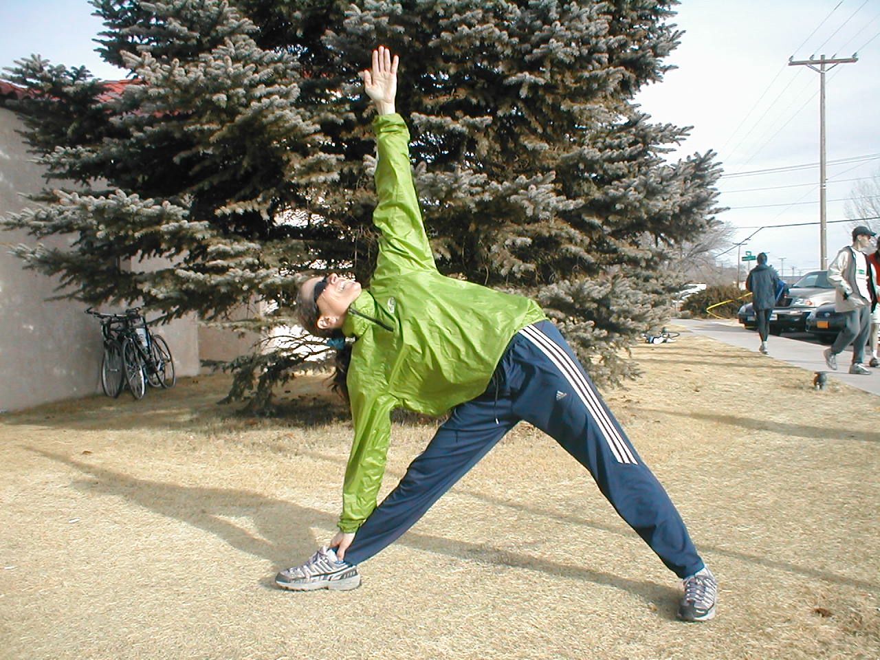 #1 – Lisa “Vishnu Doll” Goldsmith – an HP Yoga Student – enjoys Trikonasana after we crushed the existing Mixed Teams record at Mt. Taylor Winter Quadrathlon in 06.