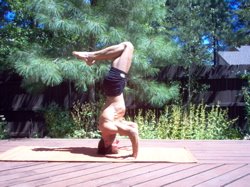 in HP Yoga, i teach Unsupported HeadStand (Asalambha Sirsasana) from DownDog. In the photo above, i have moved from Downward Facing Down onto my headstand stance. i move my hands to ‘catch the feet’ in this phase. once the feet are caught, the Nadis all along the bottom of both feet should be massaged by finger strength. Doing this accomplishes two things; it appropriately strengthens the neck and shoulders for Headstand while cleansing the Nadis by way of acupressure (granthi) points on the tops and bottoms of the feet. This one phase may; require years to appropriately and naturally strengthen the top of head, neck, torso to withstand the gravity of Sirsansa. It took me eleven hard years to do 63 consecutive pull ups. a enduring Sirsasana should take at least as long so that the body and balance and mental focus is capable of the pranayamic energetics for which Sirsasana is all about!