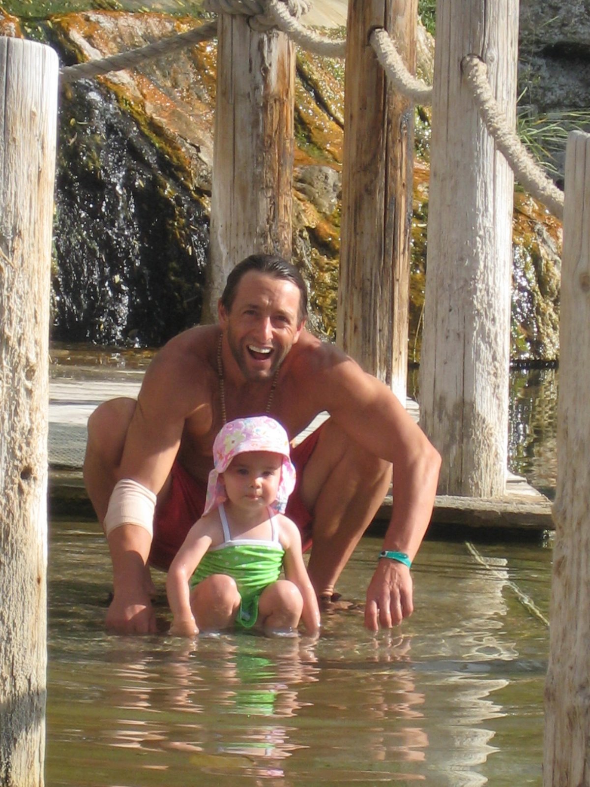 Dewa and injured daddy ilg the other day at the Pagosa Mineral Hot Springs. the Native name of my old h(om)etown – Pagosa – means, “Healing Waters” and after my high-speed mountain bike racing crash last Saturday, i truly put these collective pools of ancient healing hot springs to the test…and, they produced an incredible healing effect upon my road rash and deep bone contusions. though yogi squatting continually throughout the day alongside Dewa is painful, keeping my skin and repairing connective tissue moving through big range of functional movements is imperative to 100% healing. many athletes make the mistake of too little movement (cause it hurts) while healing. unless you move like a toddler while healing deep scrapes and bruises, the resultant connective fabric matures into a restrictive mal-aligned gross ‘pile of fiber spaghetti.’ gotta keep moving, no matter how much it hurts.