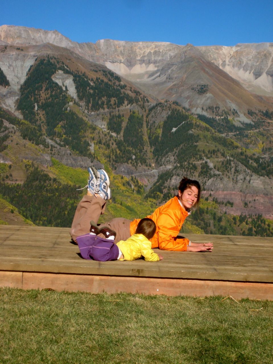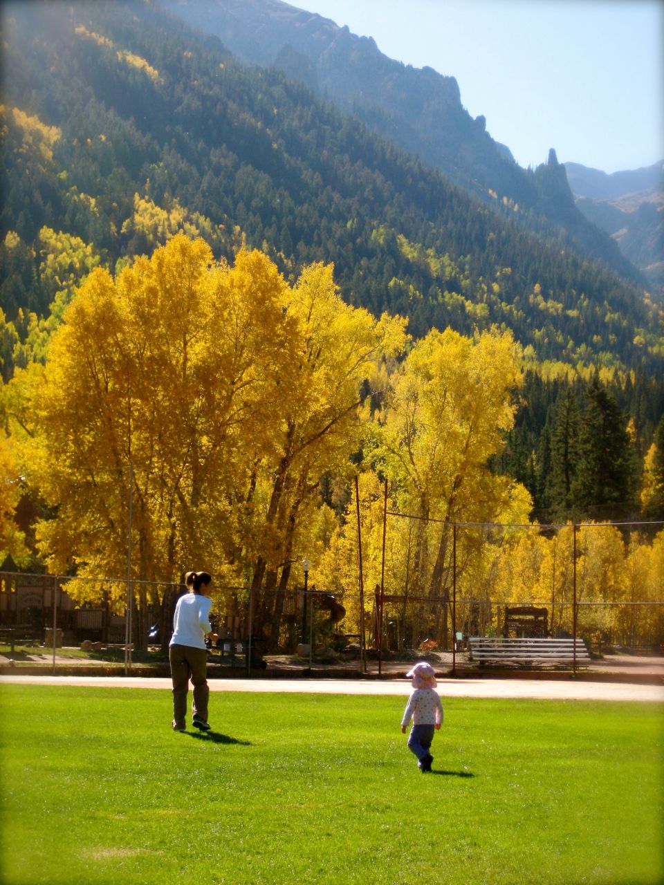 Telluride’s Town Park which offers the general public access to swimming, duck/fish pond for kids, two kids playgrounds, creeking, baseball, camping, horseshoes, showers, ice rink, indoor soccer, and i forget what all else dovetails directly into Bear Canyon; a world class leaping off place for ultra beautiful backcountry experiences. Muir woulda been proud. Dewa doing laps on the baseball diamond field. we’d reach one side and give, “THREE CHEERS FOR HAPPY FALL!” and run back across! photo yesterday by ilg.
