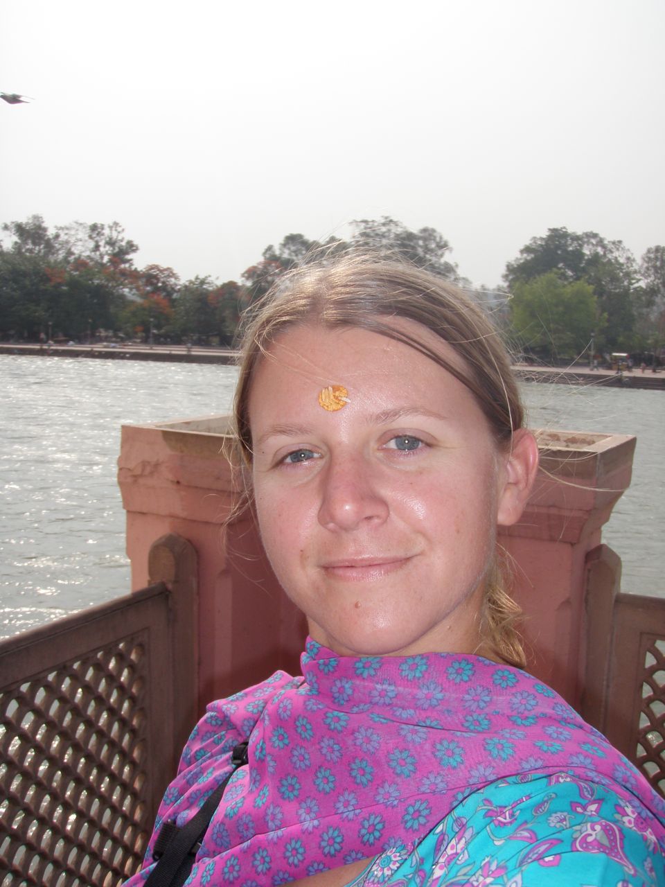 WF Devotee Yogini “Petticoat” Julie at Haridwar (“door” to Shiva), northern india after being blessed by a Hindu priest by the Holy Ganga. photo courtesy Julie Mueller.