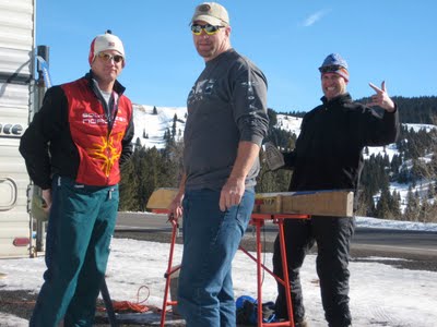 Pulling into the small Parking Lot, i saw my old friends; National Road Time Trial Champion Clay Moseley (far right), and stalwart road racing and multi-sport enthusiast, Dave Wykoff (center). They, along with Denny, did the High Karmic work of grooming this race course which must begin two weeks before the race. The trio, who nordic race for Southwest Nordic, did a heroic job; the course condition was as impeccable as possible up here. ilg bows and applauds their veracity to Serve in such as noble effort.during my pre-ski, i felt horrible. legs as heavy as molten lava and my breath as haphazard as a CrossFit® Workout Of The Week.