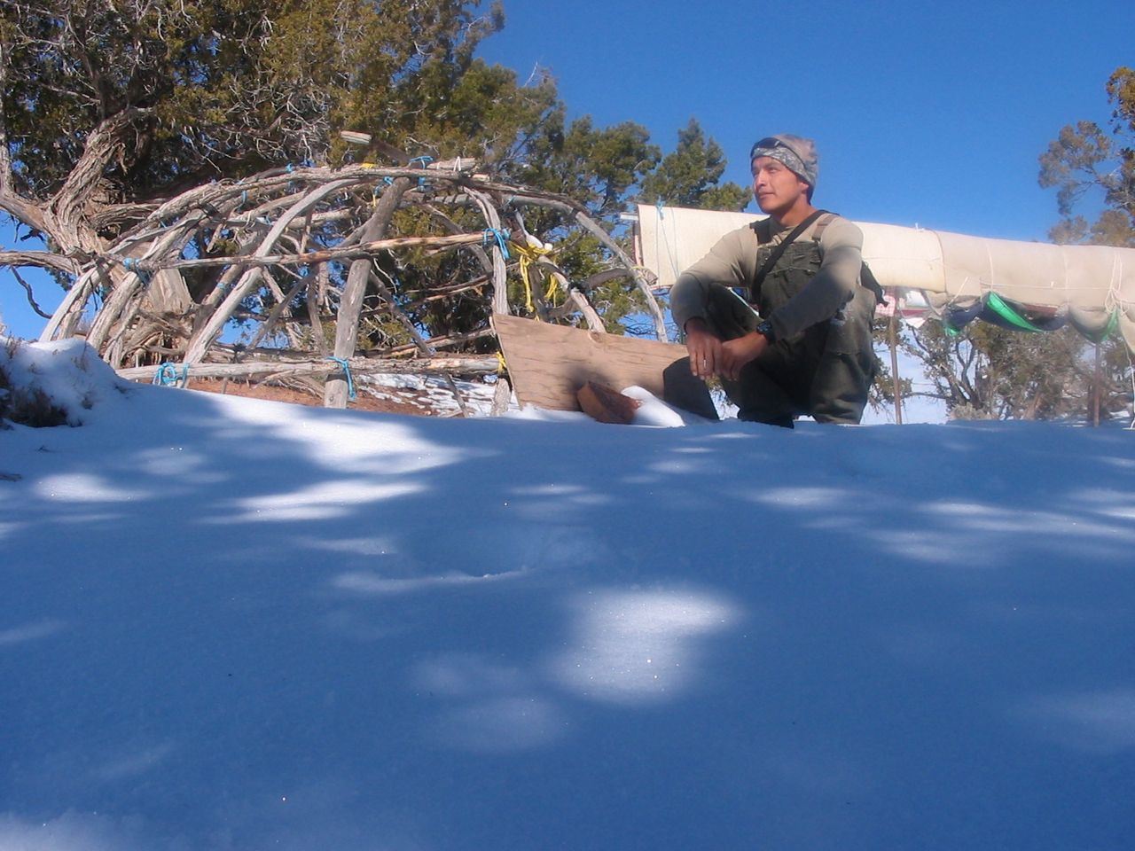 This pic above is of the skeletal-frame of our sweat lodge. It sits a mere 100 yards from the house and is nestled among the arid junipers of home. Not only was it constructed by my Uncle, but, he is the one who conducts the ceremonies from time to time. The rack of clothes directly behind my yogi-squatting-can is what serves as the walls of the lodge. Contrived of various recycled materials these rugs/carpet scraps contain the steam very well. Notice my size compared to the frame. You wouldn’t think that many could fit within, yet, it’s quite spacious during a ceremony.