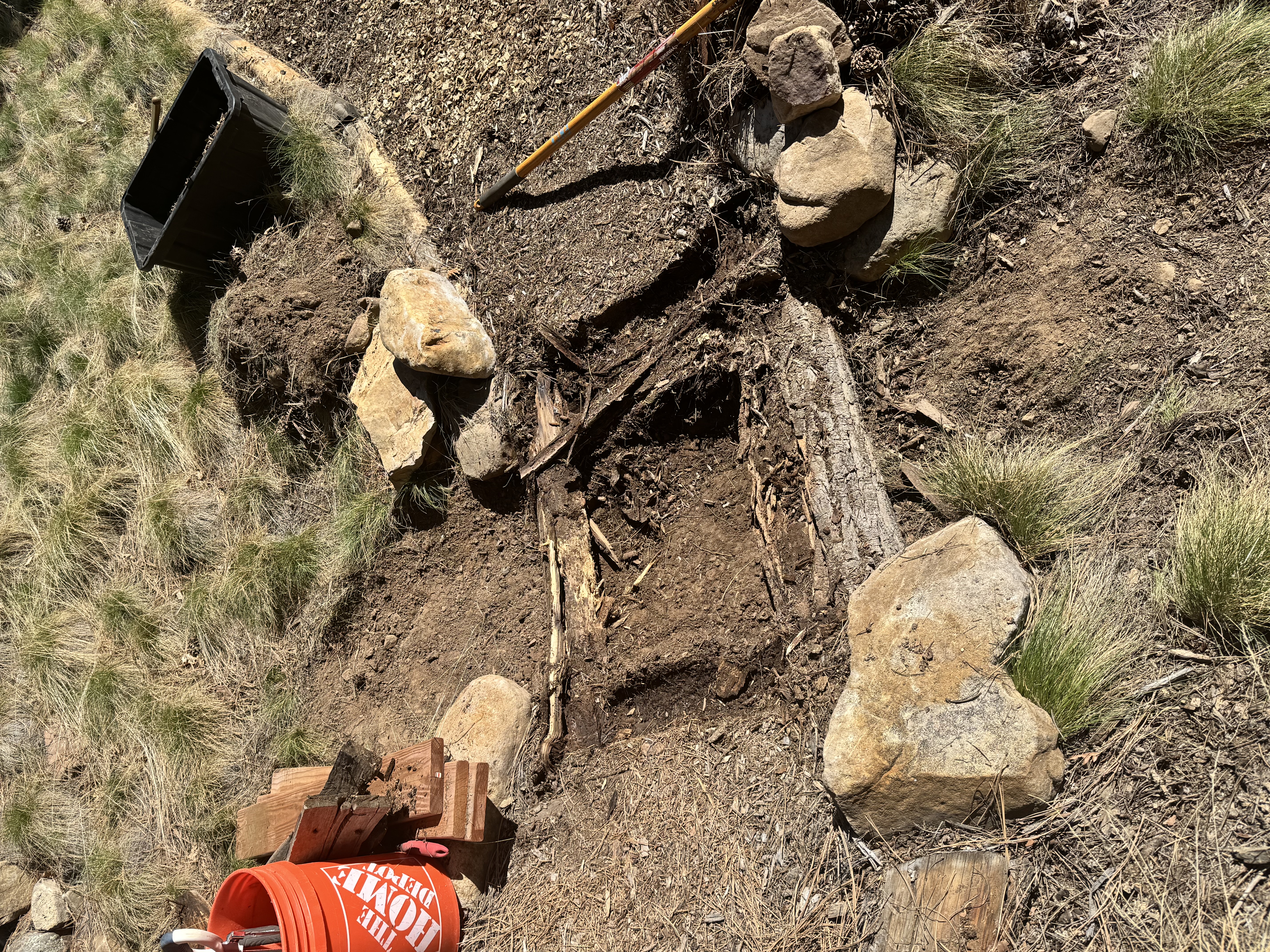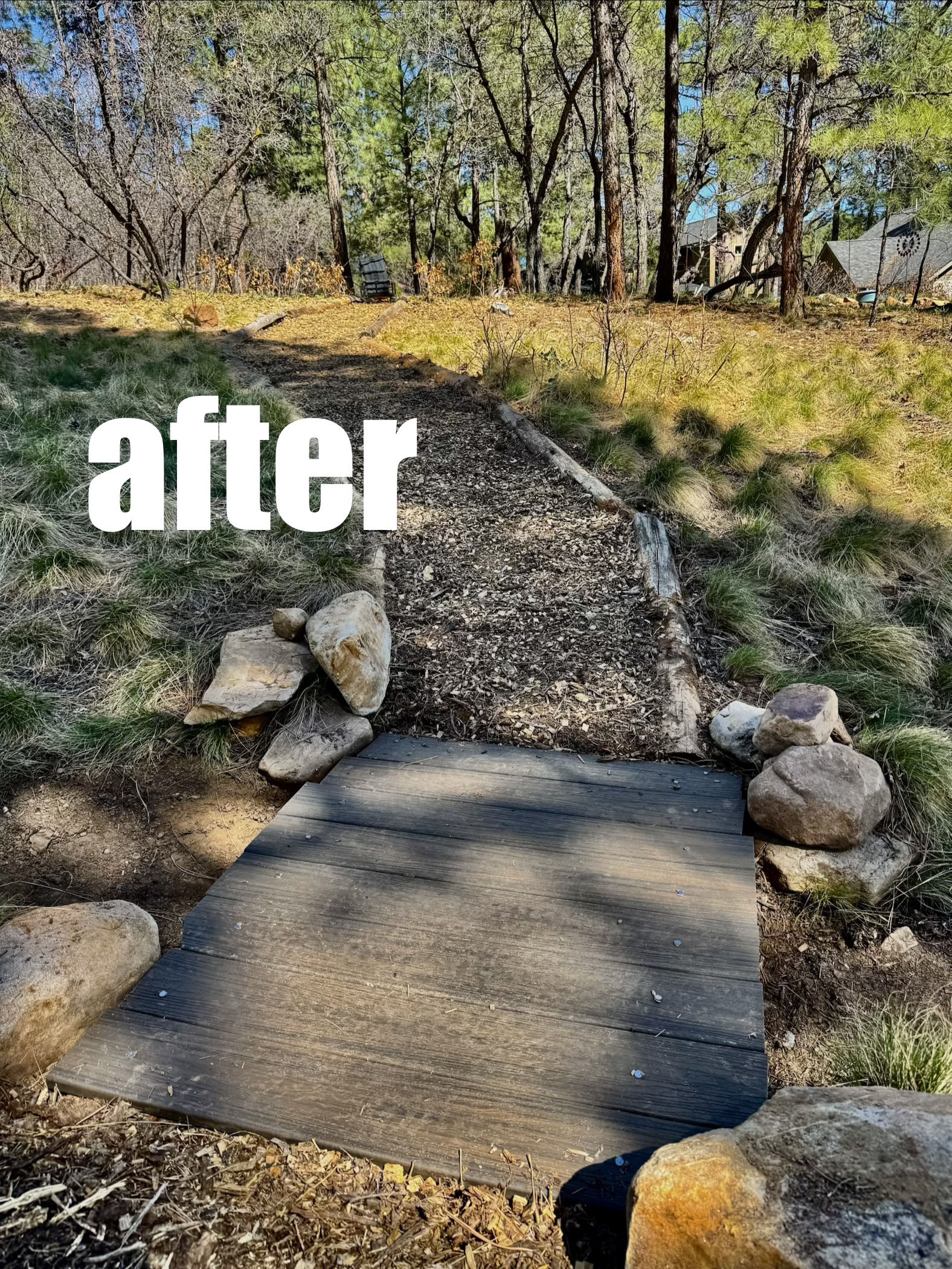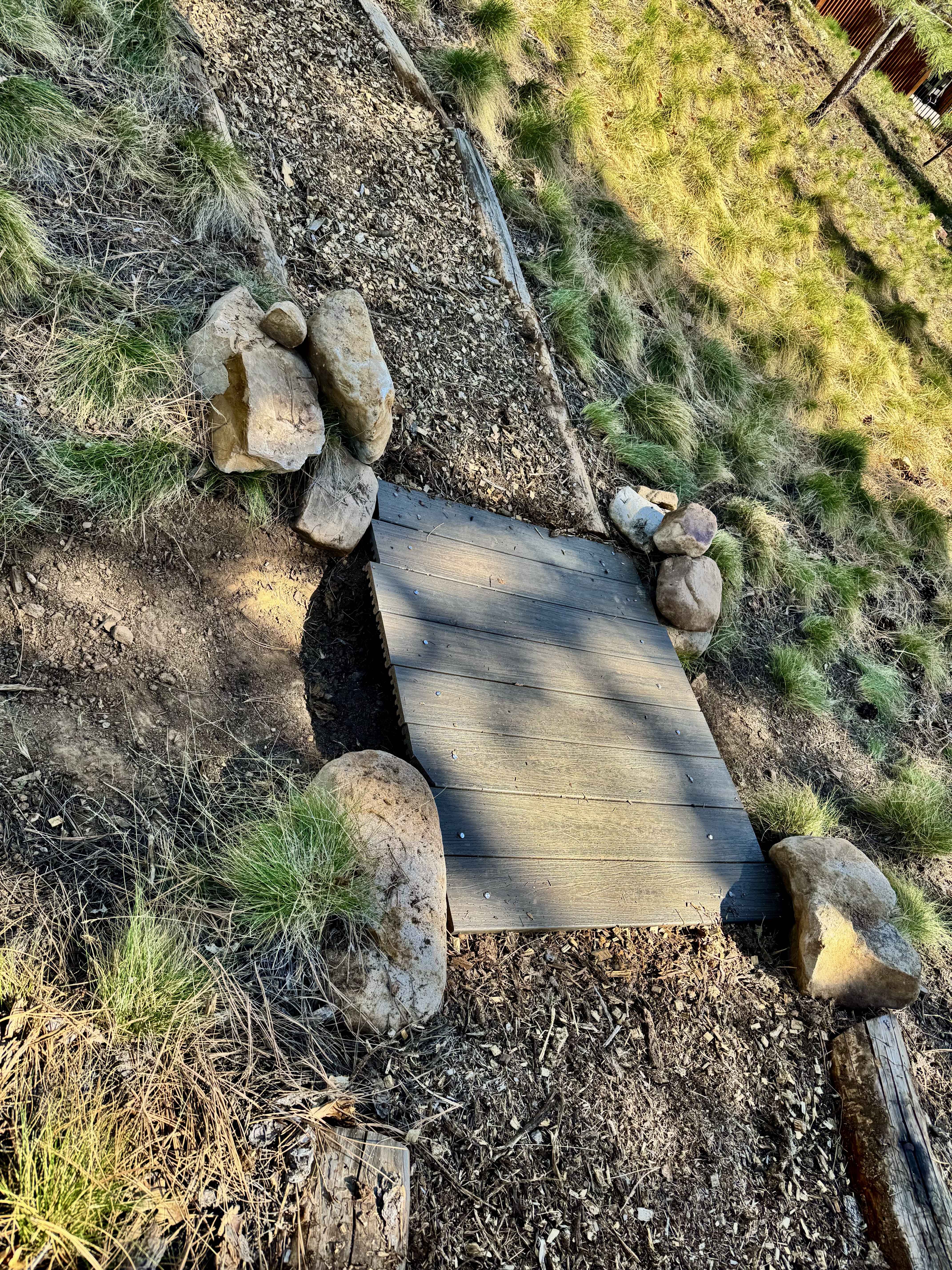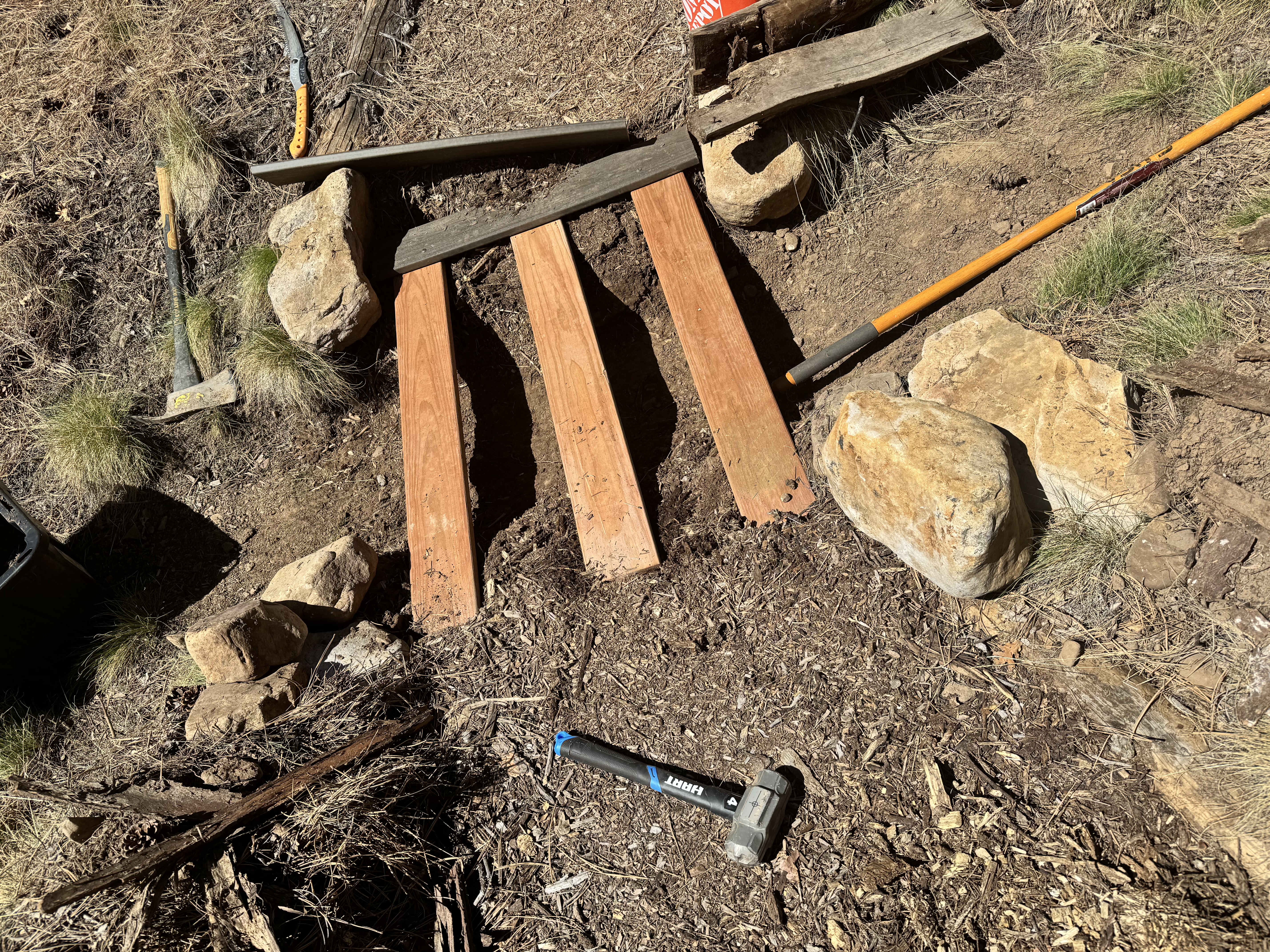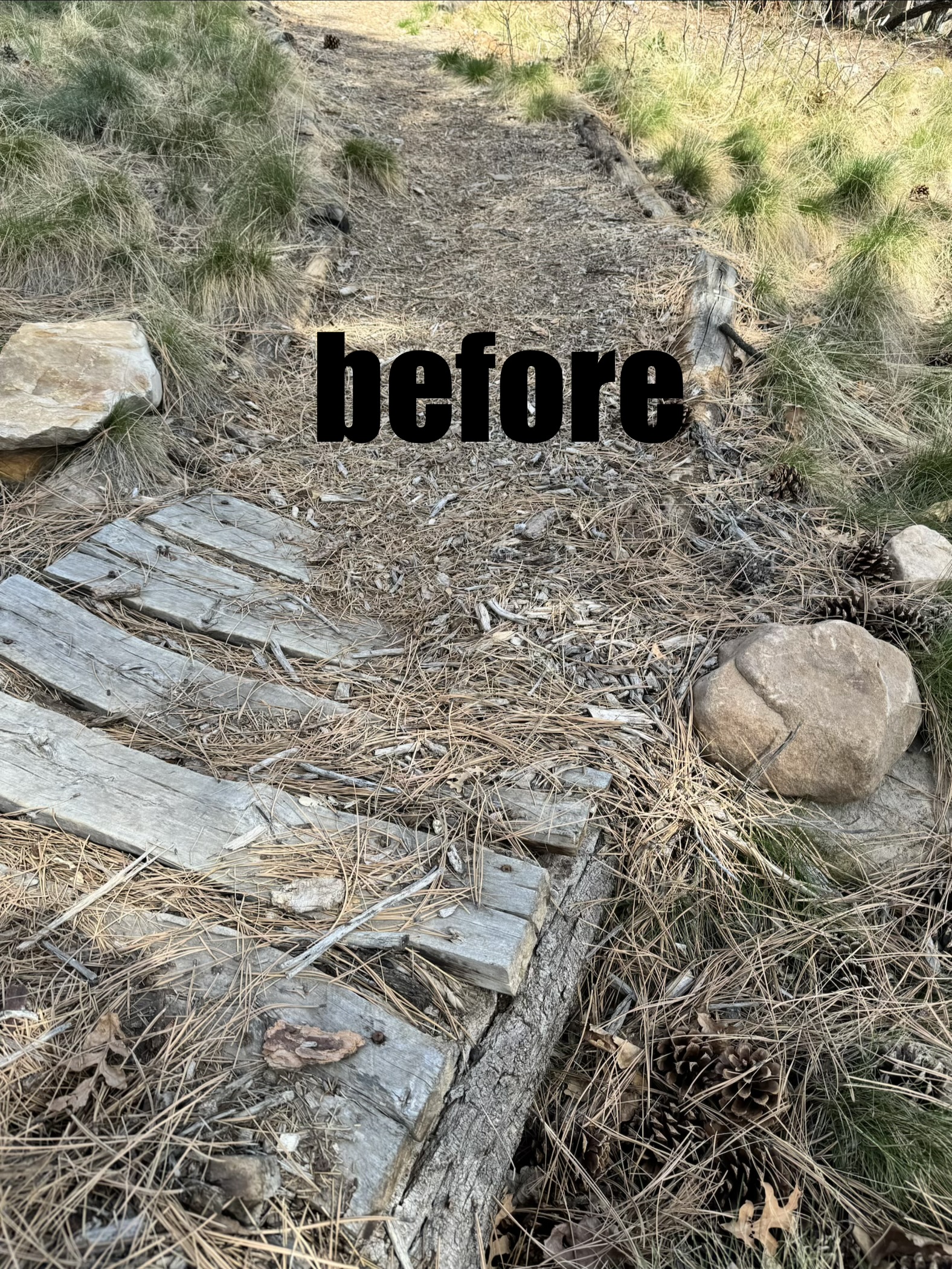 Since taking this job two years ago as Trails/Property Manager at Edgemont Highlands after retiring from many years as Crew Leader at Durango Trails® (formerly Trails 2000), this forlorn, non functioning footbridge on the TomTom Trail was a significant blimp upon many other blimps on my mind to upgrade. With 15 miles of trails under my solo charge up and down 700′ vertical feet at 7,500′ elevation? feeble ilg literally goes to sleep shuffling through the priorities of trail work jobs to do…this TomTom Trail has been a high priority… don’t know wtf the guy who had ilgs job actually did for 8 years? Yet, apparently Trail Maintenance was NOT a super high priority like it is for feeble ilg… there is literally pounds of exposed rebar on the weird timber sidings of the 7 miles of mulch trails we have and a football fields amount of exposed under trail plastic … it’s crazy…like HOW do you consider yourself to be in charge of maintaining and providing safe trails for the community and just let that shit slide for… 8 years and just collect the paycheck!?!?