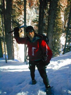 above photo by Ananda: Yet another testimony to the unmatched chi force that living the WF Path imparts: The very morning after racing to a top place (more on that later) in my 30-kilometer Langlauf Ski Race, i was up and ready for another full day of San Juan Sweat, beginning by taking a very nervous-yet-willing Ananda to my old ice climbing practice area;