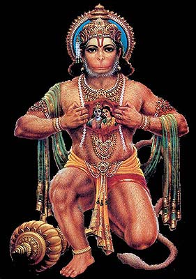 (Hanuman tears open his heartspace revealing his masters; Sita and Ram)